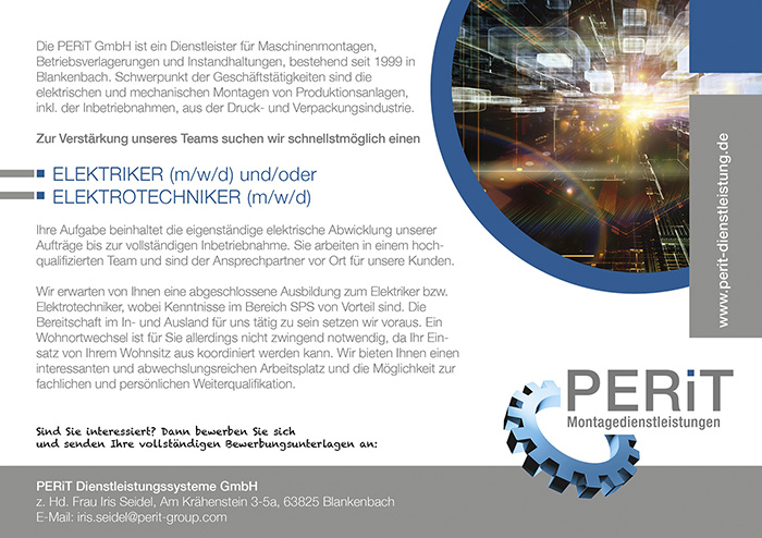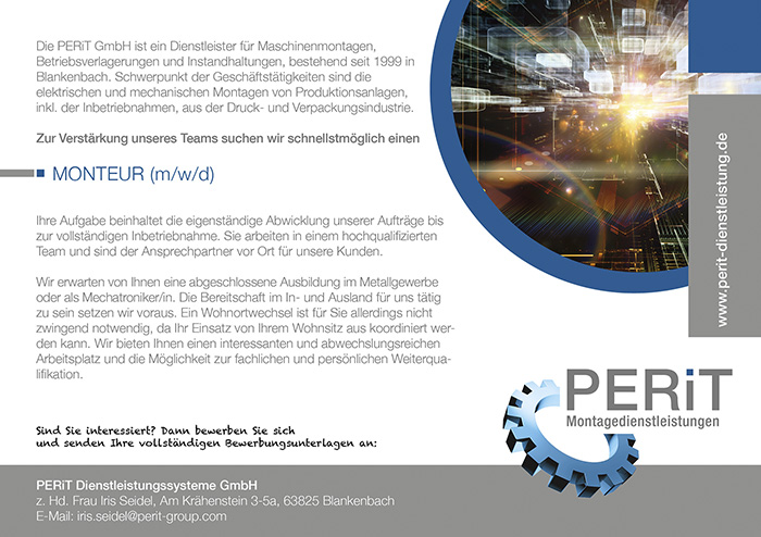 Die PERiT GmbH ist ein Dienstleister für Maschinenmontagen, Betriebsverlagerungen und Instandhaltungen, bestehend seit 1999 in